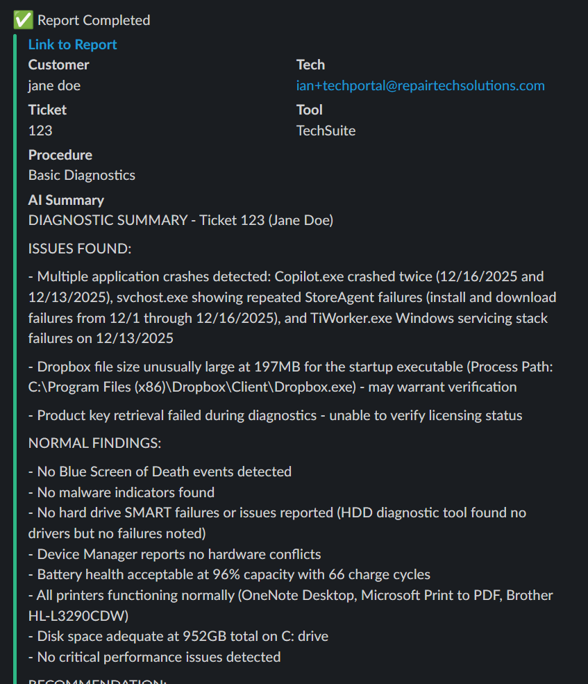 Customer, technician, ticket, tool, procedure name, link to the full Report, and an AI-generated summary when available.